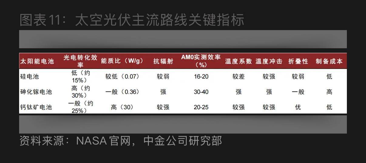 从电池技术路线应用端来看,目前应用于或处于在轨试验的“太空光伏”电池技术路线主要有三种:晶硅太阳能电池、砷化镓太阳能电池以及钙钛矿技术路线。
