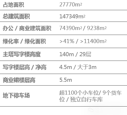 总建筑面积:约14.7万平方米(另有资料显示为147,000㎡),其中包括办公塔楼、商业裙楼和地下停车场。